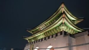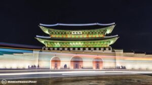 Under the night sky, Gyeongbokgung Palace is beautifully illuminated, showcasing intricate details in its architecture. The soft glow of lights enhances the elegance of the roofs and the tranquility of the surrounding gardens, creating a dreamlike ambiance that’s perfect for photography.